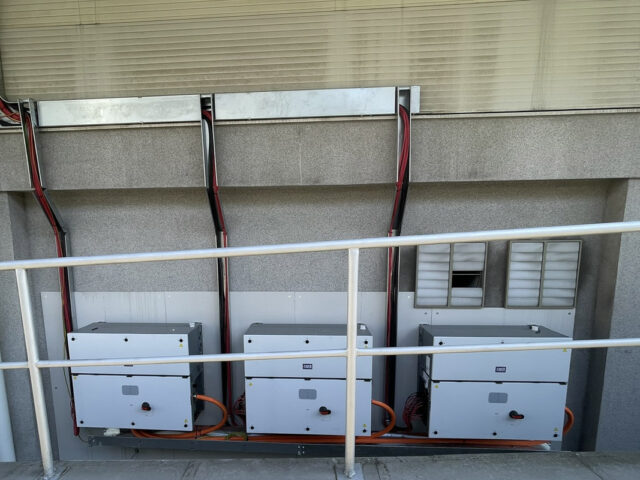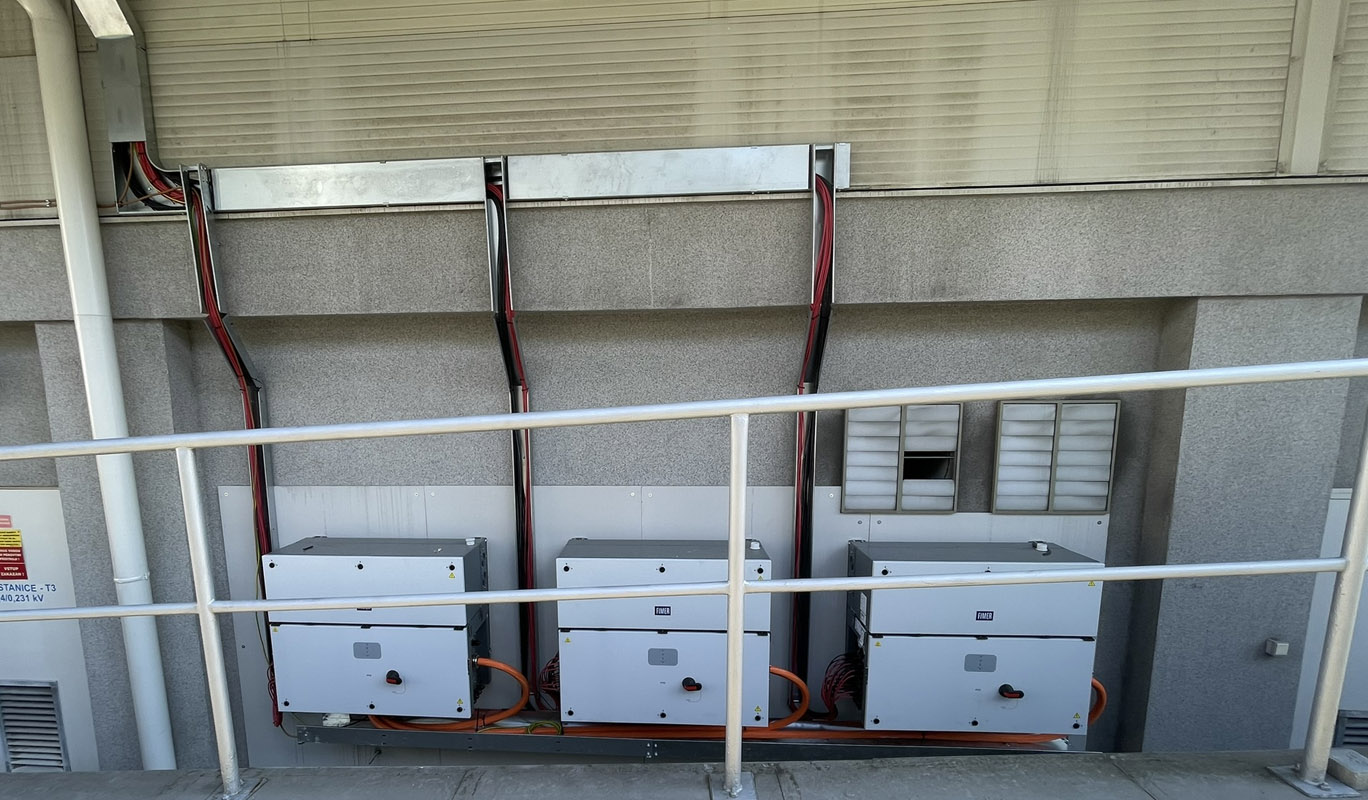 Na první střeše byla realizována fotovoltaická elektrárna o výkonu 302,76 kWp. Jako montážní systém byla zvolena technologie svařovaných kotev na PVC fólii, které jsme zajišťoval. Součástí dodávky byla také realizace kabelových tras, natažení a zapojení AC/DC kabeláže a vyhotovení konstrukce pro umístění technologie včetně jejího kompletního zapojení.